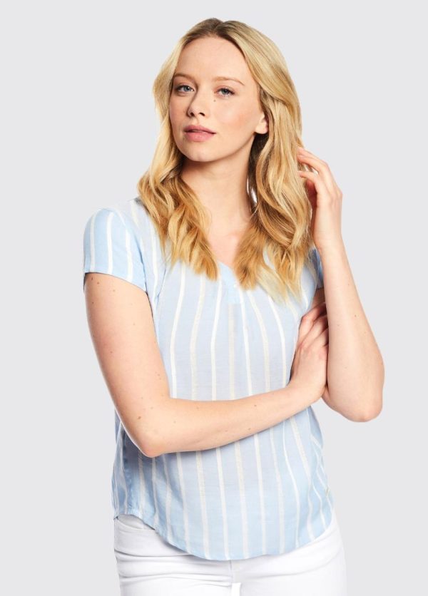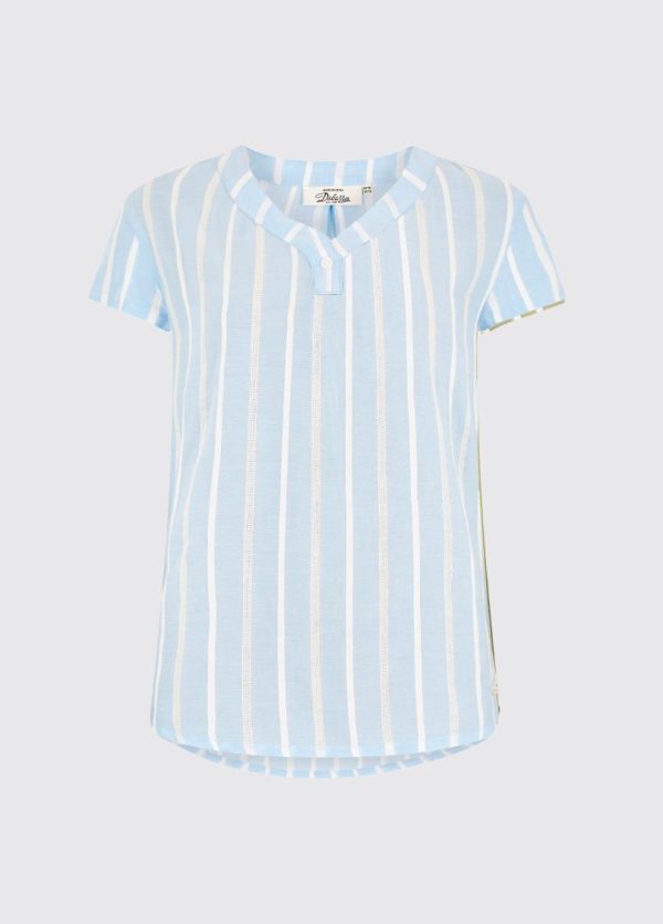 Slightly sheer, vertically striped shirt, which echoes marine and crew clothing no matter where the summer flows. Short sleeves with a Dubarry pearl button detail at the collar, gives this lightweight summer top the finesse for both comfortable city life and easy summer walks along the sea shore.